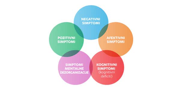 Simptomi šizofrenije mogu da se podele u pet grupa, pri čemu pacijent može da ima samo jedan simptom ili dva, a može da bude prisutno i više, koji su opisani u nastavku teksta. Isto tako, osoba kojoj je dijagnostikovana šizofrenija može duže vreme biti bez ikakvih simptom šizofrenije.