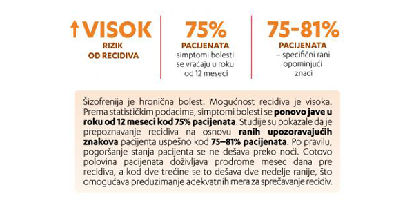 Šizofrenija je hronična bolest. Mogućnost recidiva (povratka bolesti) je visoka. Prema statističkim podacima, simptomi bolesti se ponovo jave u roku od 12 meseci kod 75% pacijenata. Rizik od recidiva se značajno smanjuje ako se terapija lekovima nastavi u skladu sa preporukama lekara. Međutim, recidiv je moguć čak i kada se pacijent pridržava režima lečenja.